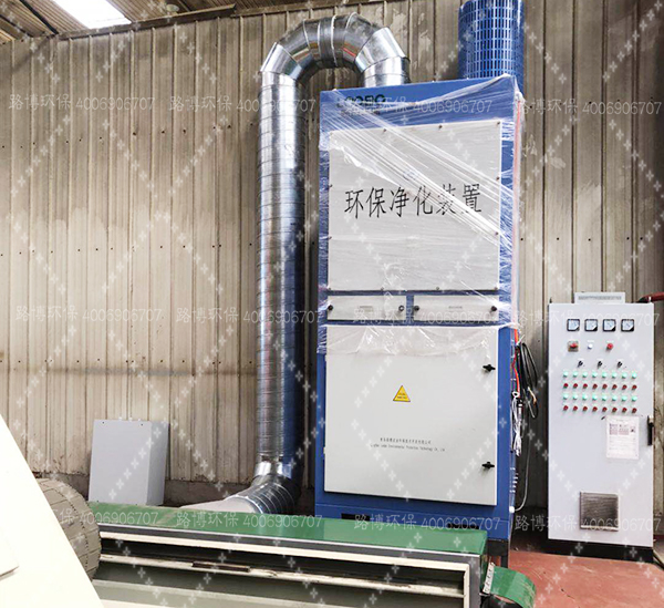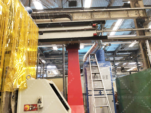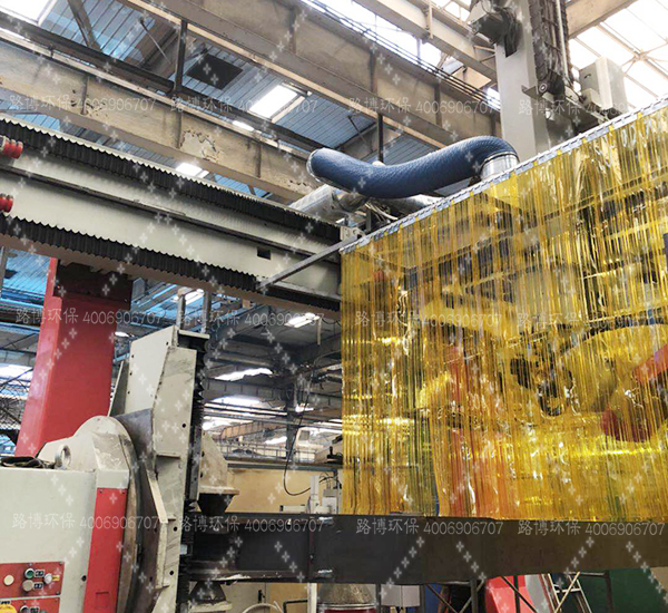 本项目用于山推焊接车间内焊接机器人工位焊接烟尘治理,机器人工位工件尺寸较大,活动范围6M*5M,机器人在焊接过程中产生大量的烟尘。根据工况,路博环保采用移动式顶吸罩对工位焊接烟尘进行捕捉,在整个使用过程中不干涉机器人的动作及工位的吊装,每个工位配置一套除尘系统,滤筒除尘器型号选用LB-CY-8.
